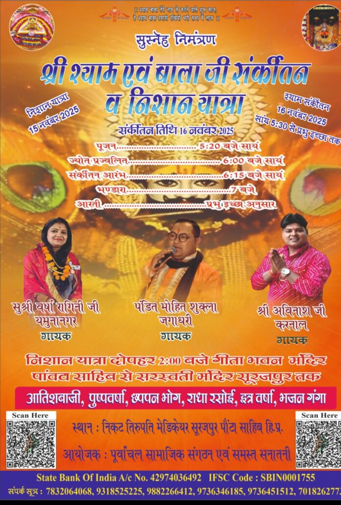 15 नवंबर को निशान यात्रा एवं 16 नवंबर को भव्य श्री श्याम संकीर्तन एवं भंडारे का होगा आयोजन