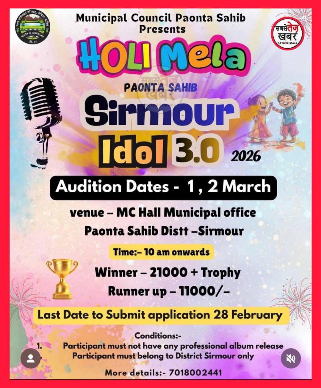 Paonta Sahib होली मेला 2026: “Sirmour idol 3.0” के लिए 1और 2 मार्च को होंगे ऑडिशन…28 फरवरी तक कर सकते है आवेदन..