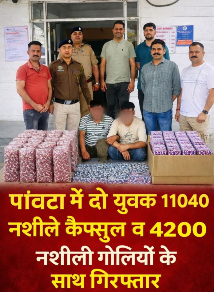 भारी मात्रा में पांवटा में दो युवक 11040 नशीले कैप्सुल व 4200 नशीली गोलियों बरामद ।