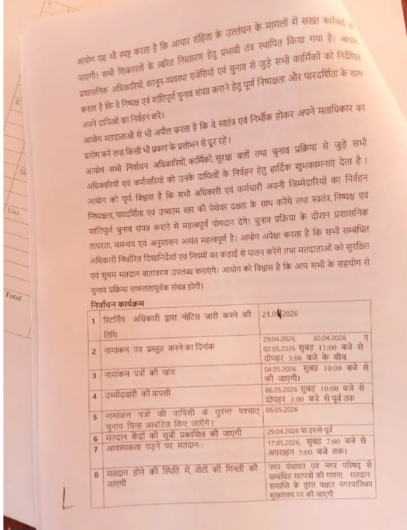 हिमाचल प्रदेश के 51 नगर निकायों में चुनाव 17 मई 2026 को होंगे। राज्य निर्वाचन आयुक्त अनिल खाची ने मंगलवार को चार नगर निगम (सोलन, मंडी, धर्मशाला व पालमपुर) समेत 47 नगर पंचायत और नगर परिषदों में इलेक्शन की तारीखों का एलान कर दिया है। इसी के साथ शहरी निकायों में आचार संहिता लागू हो गई है।